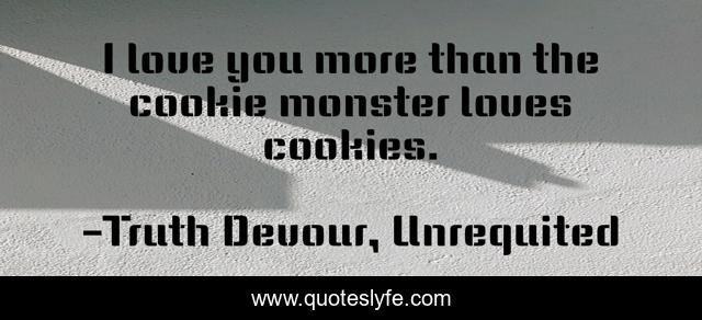 This page presents the quote "I love you more than the cookie monster loves cookies.". Author of this quote is Truth Devour, Unrequited. This quote is about faith, love, kindred-spirits, joy, karmic, soul, romance, twin-flames, sated,.