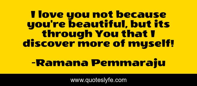 This page presents the quote "I love you not because you're beautiful, but its through You that I discover more of myself!". Author of this quote is Ramana Pemmaraju. This quote is about couples, love, soulmates, soul, platonic-love, friendship, affection,.