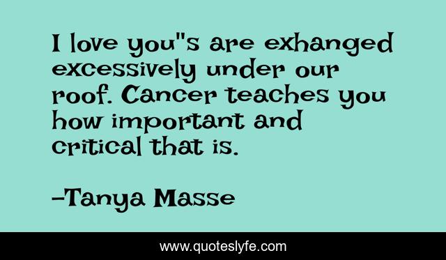 This page presents the quote "I love you"s are exhanged excessively under our roof. Cancer teaches you how important and critical that is.". Author of this quote is Tanya Masse. This quote is about life, quotes-about-cancer, cancer, quotes-about-life,.