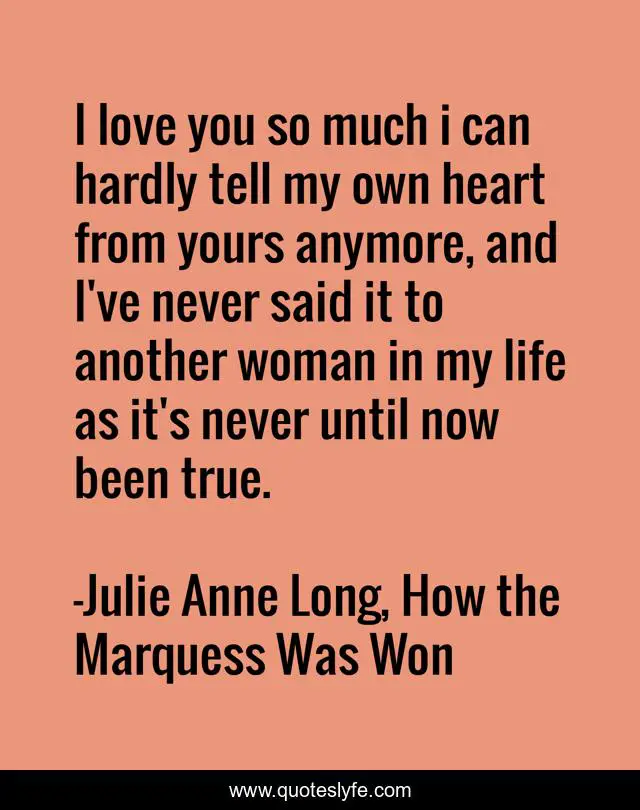 This page presents the quote "I love you so much i can hardly tell my own heart from yours anymore, and I've never said it to another woman in my life as it's never until now been true.". Author of this quote is Julie Anne Long, How the Marquess Was Won. .