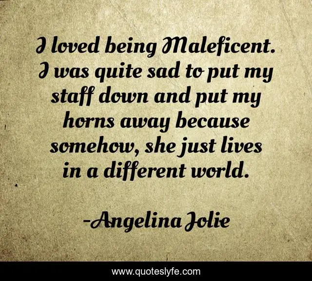 This page presents the quote "I loved being Maleficent. I was quite sad to put my staff down and put my horns away because somehow, she just lives in a different world.". Author of this quote is Angelina Jolie. This quote is about world, she, loved,.
