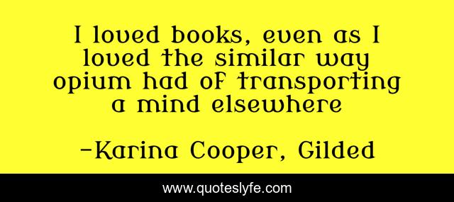 This page presents the quote "I loved books, even as I loved the similar way opium had of transporting a mind elsewhere". Author of this quote is Karina Cooper, Gilded. This quote is about opium, drugs, escapism, mind, books, addiction, reading,.