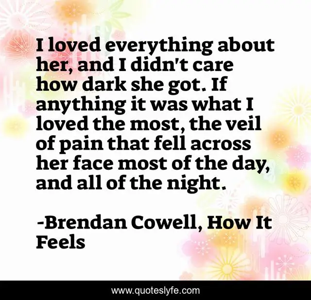 This page presents the quote "I loved everything about her, and I didn't care how dark she got. If anything it was what I loved the most, the veil of pain that fell across her face most of the day, and all of the night.". Author of this quote is Brendan Cowell, How It Feels. This quote is about grief, first-love,.