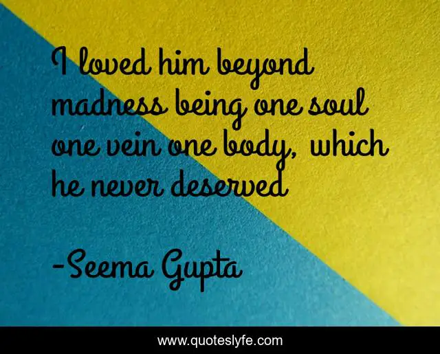 This page presents the quote "I loved him beyond madness being one soul one vein one body, which he never deserved". Author of this quote is Seema Gupta. This quote is about broken-heart, life, lonely, love, divine-love, heartbreak, passion, deep-love, inspirational,.