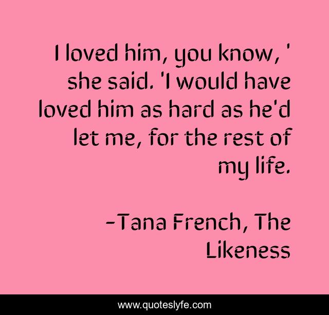 This page presents the quote "I loved him, you know, ' she said. 'I would have loved him as hard as he'd let me, for the rest of my life.". Author of this quote is Tana French, The Likeness. This quote is about tana-french, love, the-likeness, quote, sad, declarations-of-love, affection,.