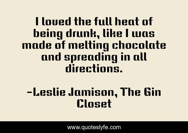 This page presents the quote "I loved the full heat of being drunk, like I was made of melting chocolate and spreading in all directions.". Author of this quote is Leslie Jamison, The Gin Closet. This quote is about drunken-behaviour, drinking, drunkenness, drunk,.