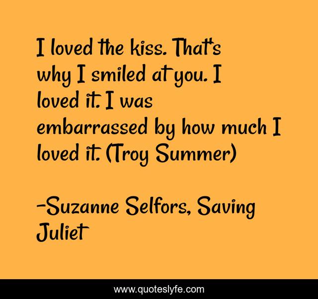 This page presents the quote "I loved the kiss. That's why I smiled at you. I loved it. I was embarrassed by how much I loved it. (Troy Summer)". Author of this quote is Suzanne Selfors, Saving Juliet. This quote is about kissing, love, affection,.