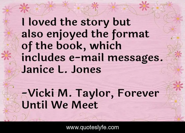 This page presents the quote "I loved the story but also enjoyed the format of the book, which includes e-mail messages. Janice L. Jones". Author of this quote is Vicki M. Taylor, Forever Until We Meet. This quote is about e-mail, forever-love, love-story, format,.
