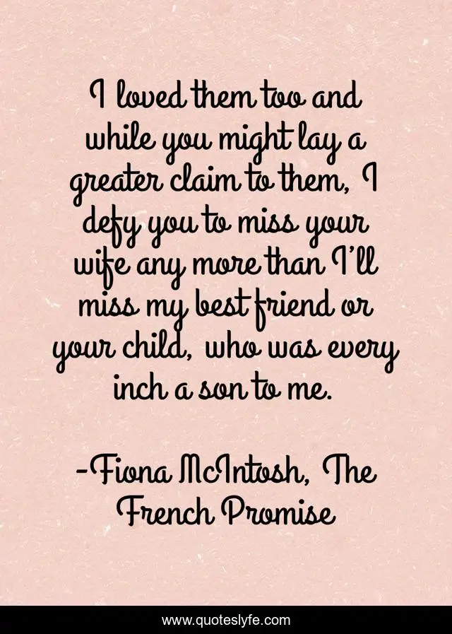 This page presents the quote "I loved them too and while you might lay a greater claim to them, I defy you to miss your wife any more than I’ll miss my best friend or your child, who was every inch a son to me.". Author of this quote is Fiona McIntosh, The French Promise. This quote is about loss, love, family, affection,.