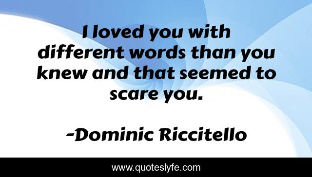 This page presents the quote "I loved you with different words than you knew and that seemed to scare you.". Author of this quote is Dominic Riccitello. This quote is about life, afraid, love, relationship, quote, scared, afraid-of-love, writing, thoughts,.