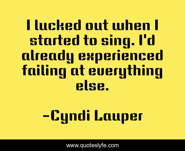 This page presents the quote "I lucked out when I started to sing. I'd already experienced failing at everything else.". Author of this quote is Cyndi Lauper. This quote is about started, everything, failing,.