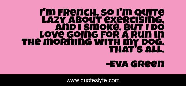 This page presents the quote "I'm French, so I'm quite lazy about exercising, and I smoke. But I do love going for a run in the morning with my dog. That's all.". Author of this quote is Eva Green. This quote is about love, dog, affection, morning,.