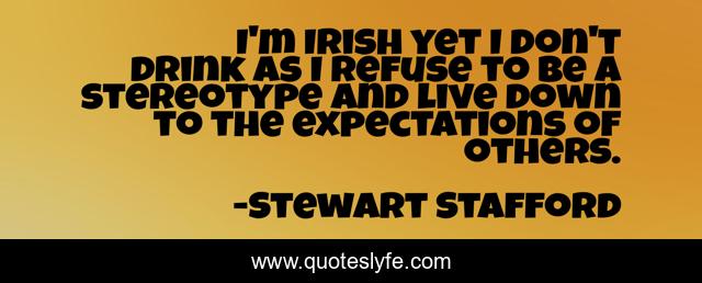 This page presents the quote "I'm Irish yet I don't drink as I refuse to be a stereotype and live down to the expectations of others.". Author of this quote is Stewart Stafford. This quote is about irishmen, irish, alcohol, stereotype, stereotyped-prejudices, irish-writer, stereotypes,.
