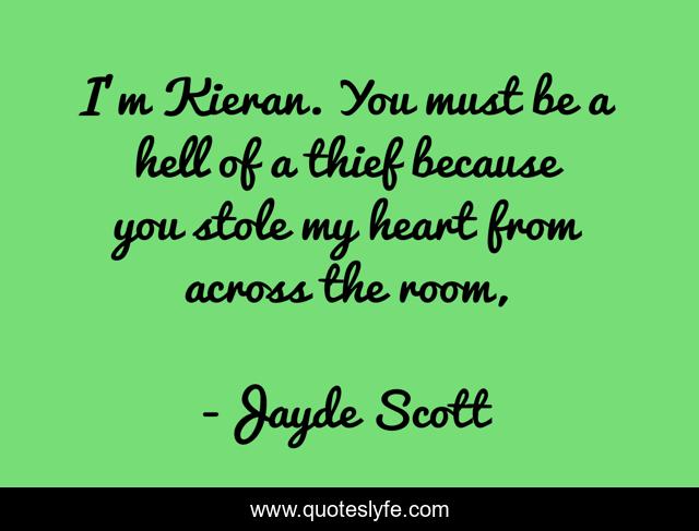 This page presents the quote "I'm Kieran. You must be a hell of a thief because you stole my heart from across the room, ". Author of this quote is Jayde Scott. This quote is about enthusiasm, humor, dead-beyond, inspirational, romantic,.