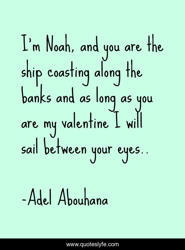 This page presents the quote "I'm Noah, and you are the ship coasting along the banks and as long as you are my valentine I will sail between your eyes..". Author of this quote is Adel Abouhana. This quote is about valentine-s-day, the-higher-self, love, human-nature, famous-authors, famous, divine-love, poetry, spiritual-psychology,.