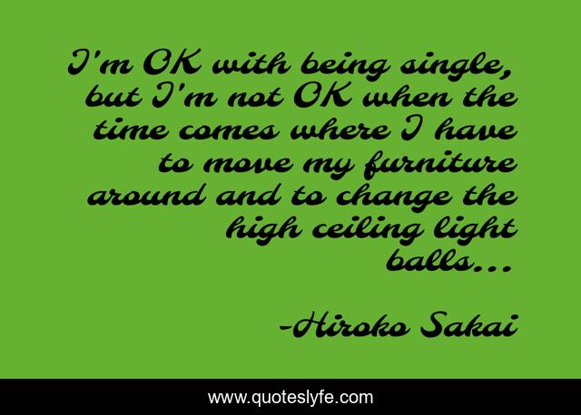 This page presents the quote "I'm OK with being single, but I'm not OK when the time comes where I have to move my furniture around and to change the high ceiling light balls...". Author of this quote is Hiroko Sakai. This quote is about single-life, funny, woman, love, humorous, light-ball, single, comedy, affection,.