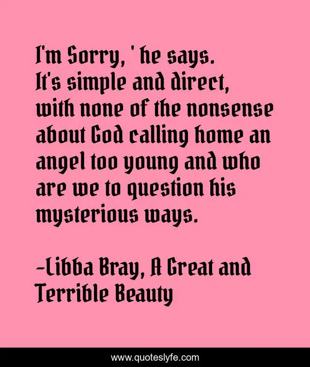This page presents the quote "I'm Sorry, ' he says. It's simple and direct, with none of the nonsense about God calling home an angel too young and who are we to question his mysterious ways.". Author of this quote is Libba Bray, A Great and Terrible Beauty. This quote is about religion, forgiveness,.