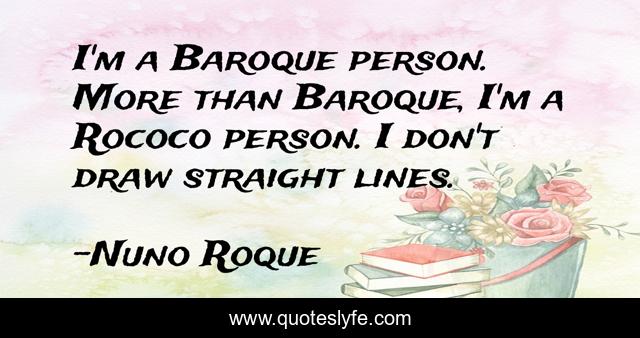 This page presents the quote "I'm a Baroque person. More than Baroque, I'm a Rococo person. I don't draw straight lines.". Author of this quote is Nuno Roque. This quote is about excentric, funny, baroque-art, artists-life, art, artist, humorous, rococo, artists,.