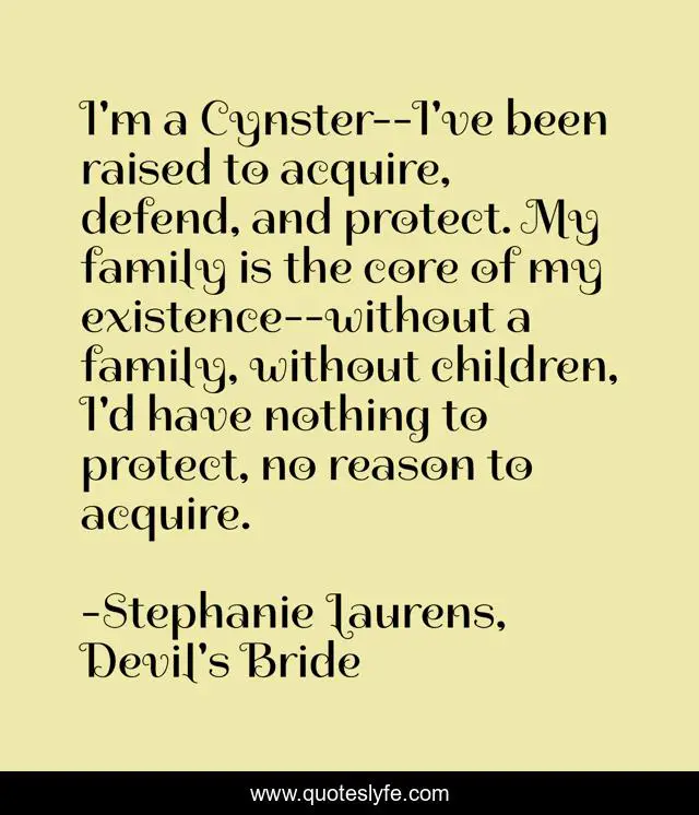 This page presents the quote "I'm a Cynster--I've been raised to acquire, defend, and protect. My family is the core of my existence--without a family, without children, I'd have nothing to protect, no reason to acquire.". Author of this quote is Stephanie Laurens, Devil's Bride. .