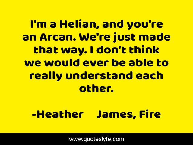This page presents the quote "I'm a Helian, and you're an Arcan. We're just made that way. I don't think we would ever be able to really understand each other.". Author of this quote is Heather James, Fire. This quote is about roxy, fire, elements-of-power, helian, brae, arcan,.