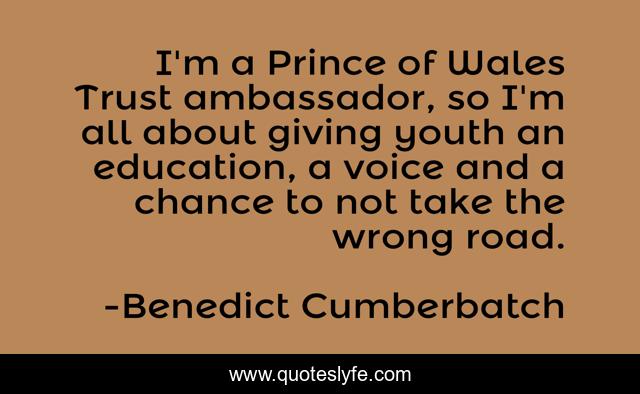 This page presents the quote "I'm a Prince of Wales Trust ambassador, so I'm all about giving youth an education, a voice and a chance to not take the wrong road.". Author of this quote is Benedict Cumberbatch. This quote is about ambassador, kids, speaking-out, prince-of-wales-trust, education, youth, wrong-road, voice,.