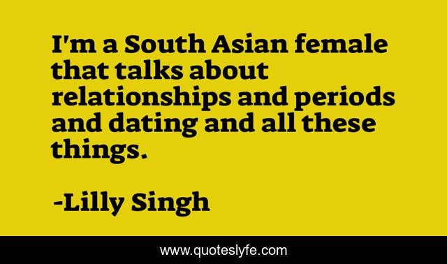 This page presents the quote "I'm a South Asian female that talks about relationships and periods and dating and all these things.". Author of this quote is Lilly Singh. This quote is about relationships, asian, female,.