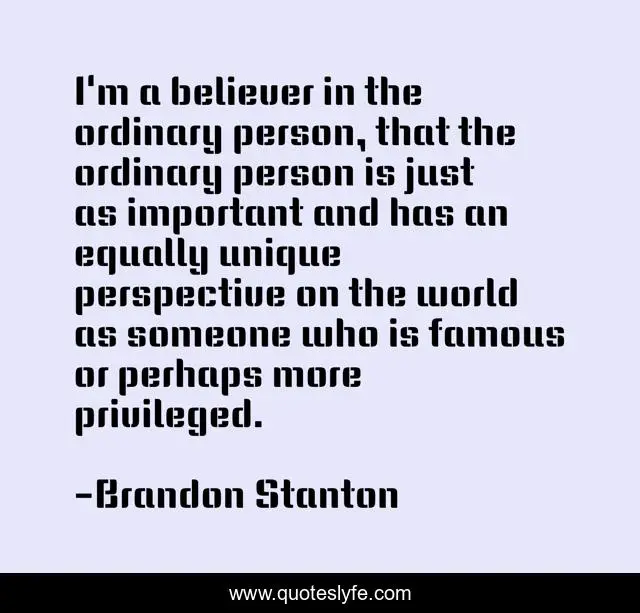This page presents the quote "I'm a believer in the ordinary person, that the ordinary person is just as important and has an equally unique perspective on the world as someone who is famous or perhaps more privileged.". Author of this quote is Brandon Stanton. This quote is about world, unique, perspective,.