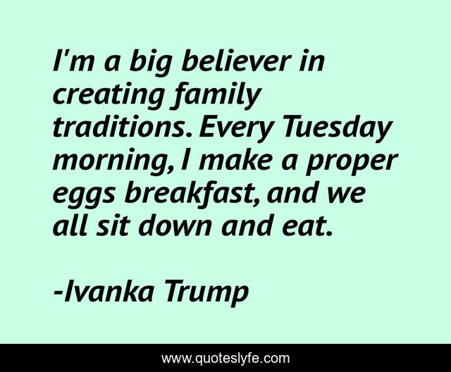 This page presents the quote "I'm a big believer in creating family traditions. Every Tuesday morning, I make a proper eggs breakfast, and we all sit down and eat.". Author of this quote is Ivanka Trump. This quote is about down, breakfast, family,.