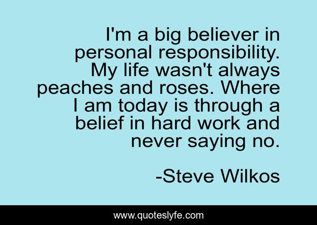 This page presents the quote "I'm a big believer in personal responsibility. My life wasn't always peaches and roses. Where I am today is through a belief in hard work and never saying no.". Author of this quote is Steve Wilkos. This quote is about life, today, hard work,.