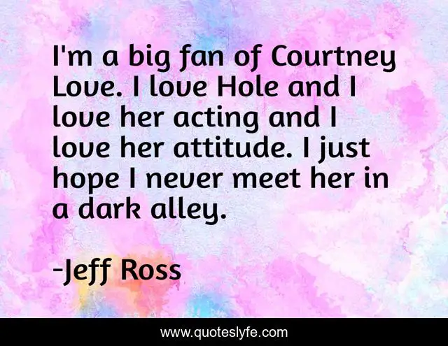 This page presents the quote "I'm a big fan of Courtney Love. I love Hole and I love her acting and I love her attitude. I just hope I never meet her in a dark alley.". Author of this quote is Jeff Ross. This quote is about dark, love, hope, affection,.