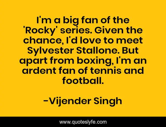 This page presents the quote "I'm a big fan of the 'Rocky' series. Given the chance, I'd love to meet Sylvester Stallone. But apart from boxing, I'm an ardent fan of tennis and football.". Author of this quote is Vijender Singh. This quote is about tennis, love, affection, football,.