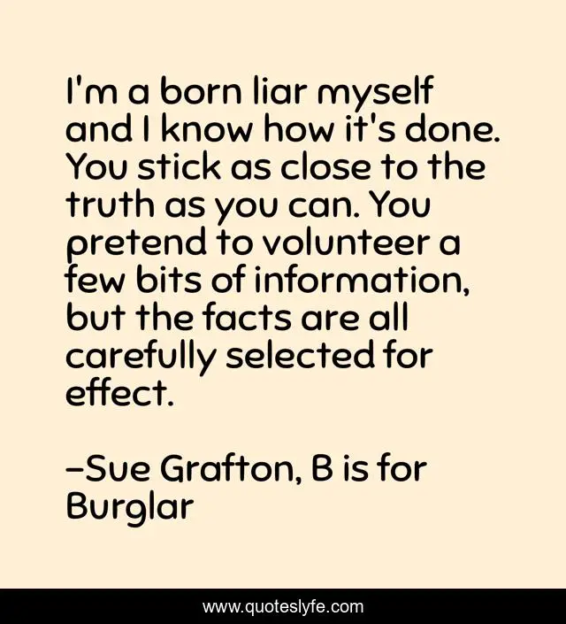 This page presents the quote "I'm a born liar myself and I know how it's done. You stick as close to the truth as you can. You pretend to volunteer a few bits of information, but the facts are all carefully selected for effect.". Author of this quote is Sue Grafton, B is for Burglar. .