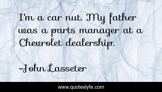 This page presents the quote "I'm a car nut. My father was a parts manager at a Chevrolet dealership.". Author of this quote is John Lasseter. This quote is about manager, father, nut,.