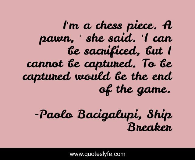 This page presents the quote "I'm a chess piece. A pawn, ' she said. 'I can be sacrificed, but I cannot be captured. To be captured would be the end of the game.". Author of this quote is Paolo Bacigalupi, Ship Breaker. This quote is about i-dunno-i-just-like-this, pawn, quote, nita, chess, ship-breaker, lucky-girl,.