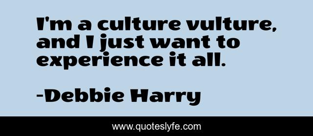 This page presents the quote "I'm a culture vulture, and I just want to experience it all.". Author of this quote is Debbie Harry. This quote is about culture, just,.