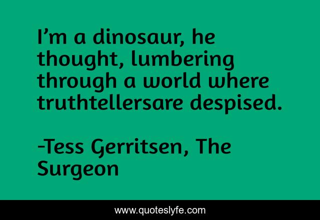This page presents the quote "I’m a dinosaur, he thought, lumbering through a world where truthtellersare despised.". Author of this quote is Tess Gerritsen, The Surgeon. This quote is about world, truth-tellers, life-lessons, truth,.