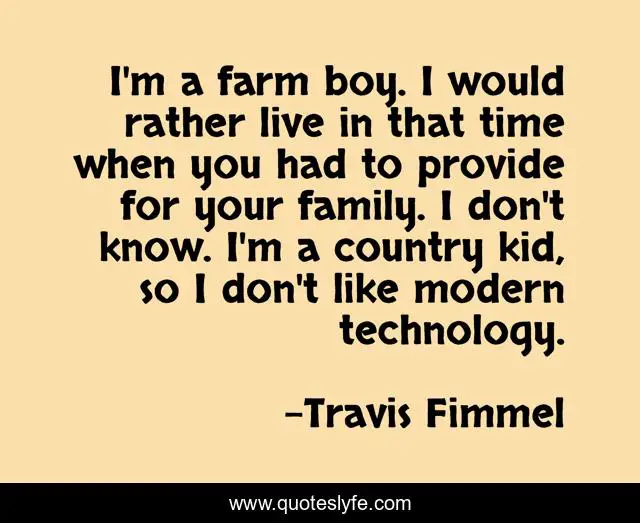 This page presents the quote "I'm a farm boy. I would rather live in that time when you had to provide for your family. I don't know. I'm a country kid, so I don't like modern technology.". Author of this quote is Travis Fimmel. This quote is about live, family, time,.