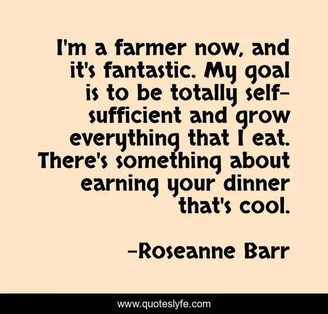 This page presents the quote "I'm a farmer now, and it's fantastic. My goal is to be totally self-sufficient and grow everything that I eat. There's something about earning your dinner that's cool.". Author of this quote is Roseanne Barr. This quote is about dinner, goal, grow,.