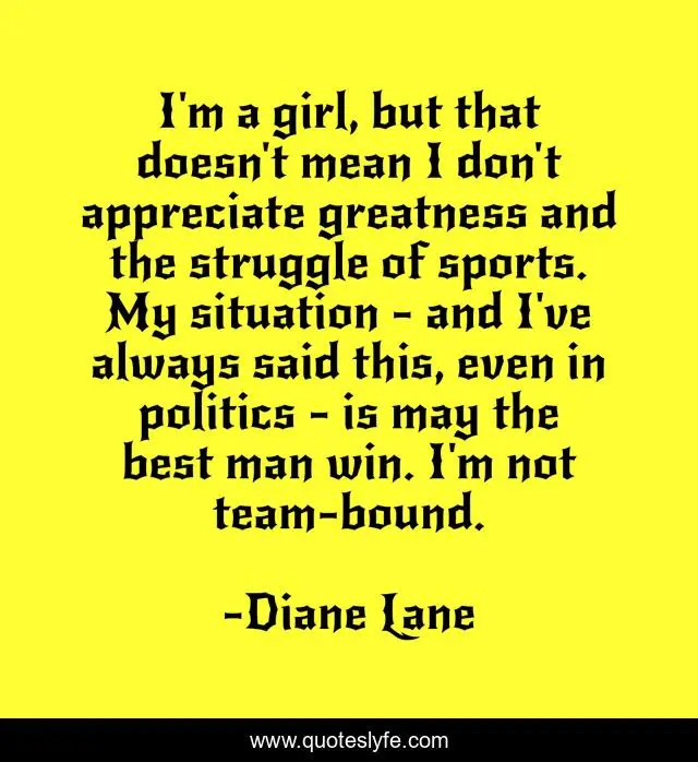 This page presents the quote "I'm a girl, but that doesn't mean I don't appreciate greatness and the struggle of sports. My situation - and I've always said this, even in politics - is may the best man win. I'm not team-bound.". Author of this quote is Diane Lane. This quote is about politics, struggle, best,.