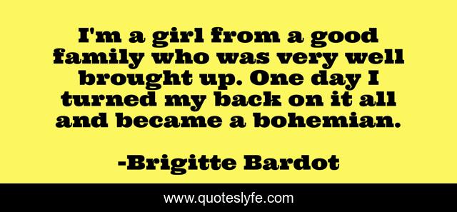 This page presents the quote "I'm a girl from a good family who was very well brought up. One day I turned my back on it all and became a bohemian.". Author of this quote is Brigitte Bardot. This quote is about girl, good, day,.
