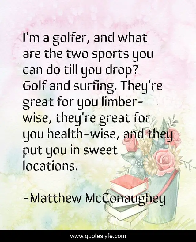 This page presents the quote "I'm a golfer, and what are the two sports you can do till you drop? Golf and surfing. They're great for you limber-wise, they're great for you health-wise, and they put you in sweet locations.". Author of this quote is Matthew McConaughey. This quote is about sweet, great, golf,.