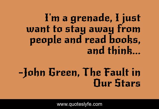 This page presents the quote "I'm a grenade, I just want to stay away from people and read books, and think...". Author of this quote is John Green, The Fault in Our Stars. This quote is about alone, the-fault-in-our-stars, john-green, grenade,.