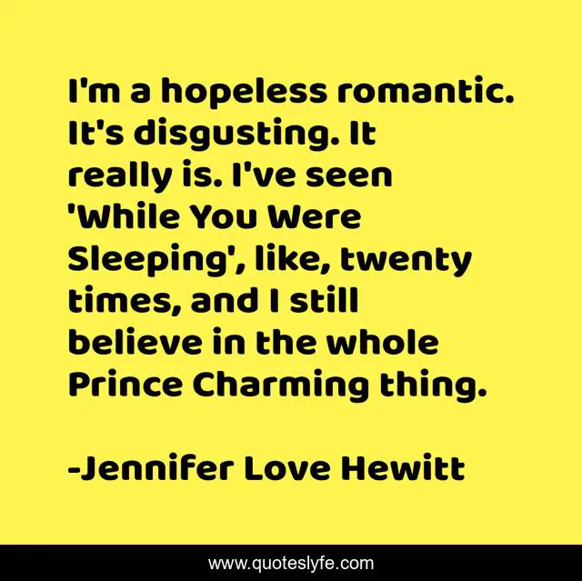 This page presents the quote "I'm a hopeless romantic. It's disgusting. It really is. I've seen 'While You Were Sleeping', like, twenty times, and I still believe in the whole Prince Charming thing.". Author of this quote is Jennifer Love Hewitt. This quote is about believe, sleeping,.