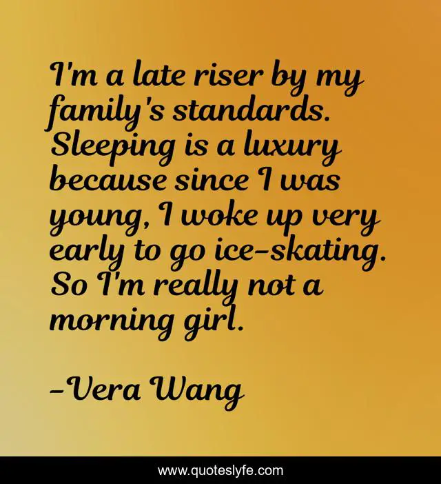 This page presents the quote "I'm a late riser by my family's standards. Sleeping is a luxury because since I was young, I woke up very early to go ice-skating. So I'm really not a morning girl.". Author of this quote is Vera Wang. This quote is about girl, luxury, family,.