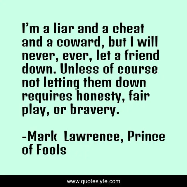 This page presents the quote "I’m a liar and a cheat and a coward, but I will never, ever, let a friend down. Unless of course not letting them down requires honesty, fair play, or bravery.". Author of this quote is Mark Lawrence, Prince of Fools. This quote is about fair-play, honesty, cheat, coward, liar, bravery,.
