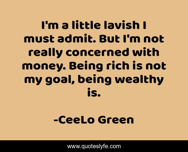 This page presents the quote "I'm a little lavish I must admit. But I'm not really concerned with money. Being rich is not my goal, being wealthy is.". Author of this quote is CeeLo Green. This quote is about admit, goal, rich,.