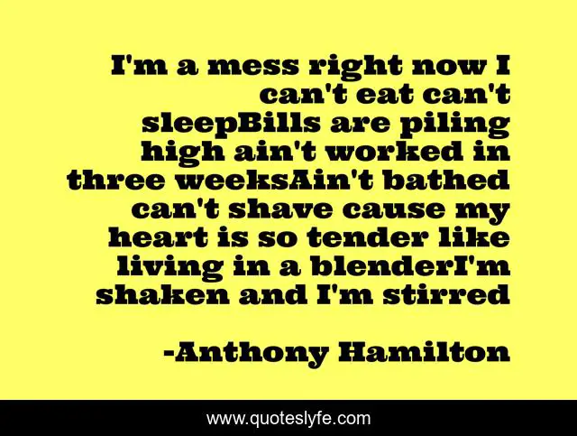 This page presents the quote "I'm a mess right now I can't eat can't sleepBills are piling high ain't worked in three weeksAin't bathed can't shave cause my heart is so tender like living in a blenderI'm shaken and I'm stirred". Author of this quote is Anthony Hamilton. This quote is about broken-heart, mess,.