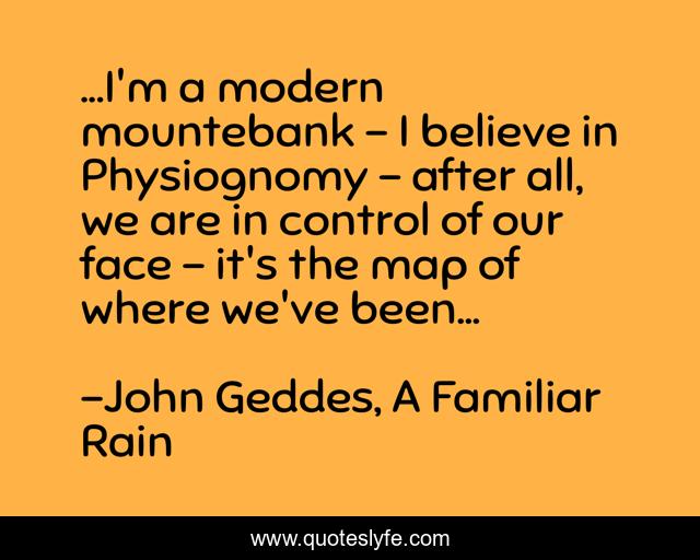 This page presents the quote "...I'm a modern mountebank - I believe in Physiognomy - after all, we are in control of our face - it's the map of where we've been...". Author of this quote is John Geddes, A Familiar Rain. This quote is about control, map, physiognomy, reflection, mountebank, face,.
