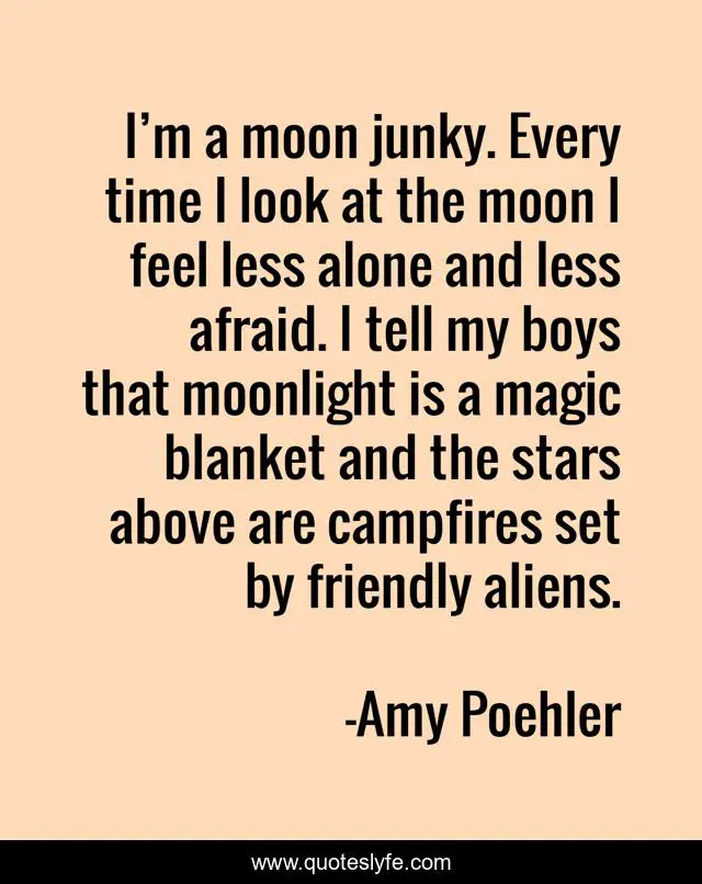 This page presents the quote "I’m a moon junky. Every time I look at the moon I feel less alone and less afraid. I tell my boys that moonlight is a magic blanket and the stars above are campfires set by friendly aliens.". Author of this quote is Amy Poehler. This quote is about magic, stars, moon,.