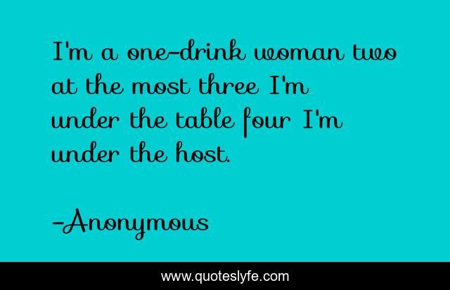 This page presents the quote "I'm a one-drink woman two at the most three I'm under the table four I'm under the host.". Author of this quote is Anonymous. This quote is about , drink, eat, merry,.